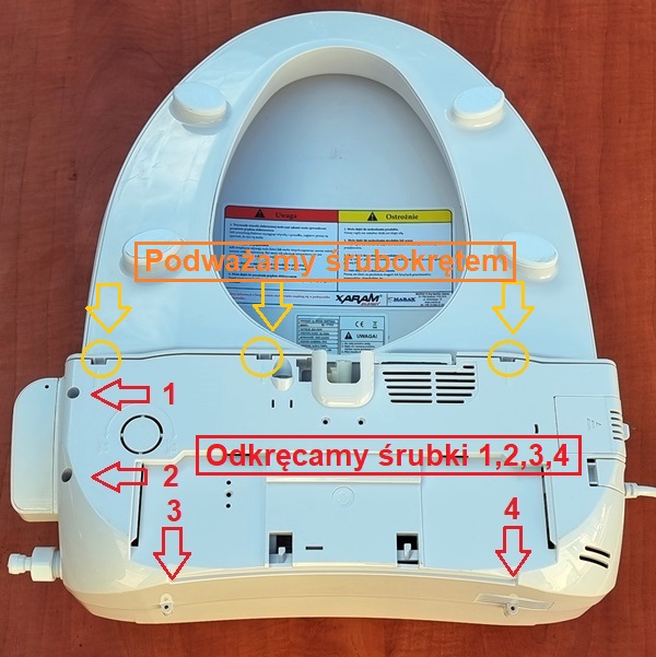 1. zdemontowaną z misy ceramicznej deskę myjącą obracamy klapą na dół i odkręcamy dwie śrubki zlokalizowane z boku deski - 1 i 2 oraz na obrzeżu deski 3 i 4.