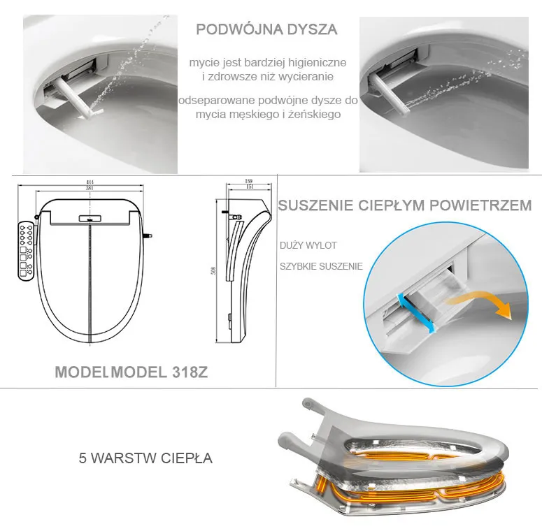 Elektroniczna deska z funkcją bidetu Tejjer TB-318Z posiada wszystkie podstawowe funkcje pozwalające zachować higienę i posada funkcje które mają szczególne znaczenie dla komfortu oraz oferowana jest w przystępnej cenie. Rekomendujemy ten model osobom szczególnie dbającym o higienę, osobom starszym wymagającym opieki i osobom niepełnosprawnym). Elektroniczny bidet jest doskonałym udogodnieniem dla gabinetów lekarskich (w szczególności ginekologicznych), domów opieki, szpitali oraz we wszystkich placówek gdzie szczególny nacisk jest kładziony na higienę, komfort i poziom życia.