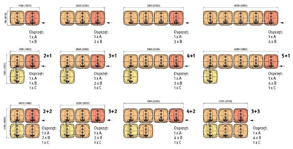 Zbiorniki olejowe jednopłaszczowe oraz dwupłaszczowe TS można łączyć w baterie. Poniżej rodzaje ułożenia baterii zbiorników olejowych.